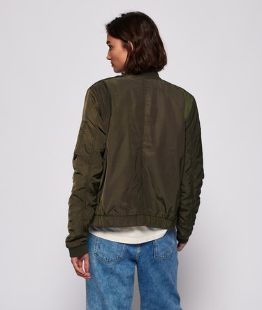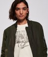Superdry women’s Carrie bomber. This padded bomber jacket features two popper fastened front pockets, zip front fastening, ribbed cuffs and hem and a sleeve pocket. The Carrie has zipped detail in the side seams, a contrast inner lining complete with inner pocket and is finished with a metal Superdry logo badge on the sleeve.