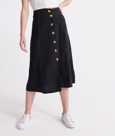 Damska spódnica midi Superdry Valley. Ta lekka, miękka spódnica jest zapinana na guziki i ma przeszycia na całości. Całości dopełnia dyskretna metalowa naszywka z logo Superdry z tyłu paska.