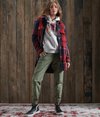 Damskie spodnie Superdry Parachute Grip. Te luźne spodnie mają zapięcie na zamek i guzik, cztery kieszenie, szlufki na pasek oraz elastyczne zakończenia nogawek. Spodnie wykończono naszywką Superdry na pasku oraz naszywką z logo Superdry nad tylną kieszenią.