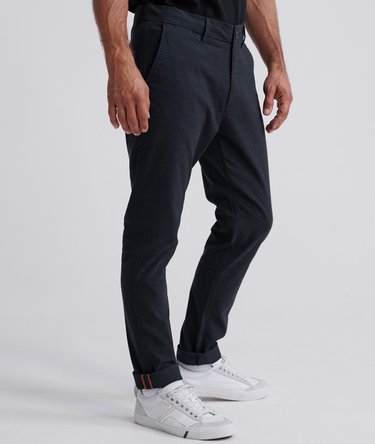 Męskie wąskie chinosy Superdry Edit. Niech wąskie chinosy Edit staną się centralnym punktem twojego stroju. Mają zapięcie na zamek i guzik, pięć kieszeni, szlufki na pasek, metalową naszywkę z logo Superdry na kieszeni oraz naszywkę z logo nad tylną kieszenią. Te spodnie będą idealnie pasować do sportowych butów, tworząc wyrafinowany, stylowy strój.