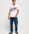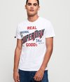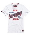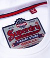 Męski T-shirt Superdry 34st Goods. Ten klasyczny T-shirt ma krótkie rękawy, okrągły dekolt oraz nadruk Superdry na piersi i jednym z rękawów z efektem spękanej farby. Całości dopełnia naszywka z logo Superdry nad obszyciem oraz metka z logo Superdry na jednym z rękawów.